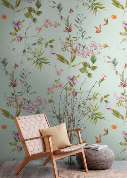 Les papiers peints Althéa Vert-bleu sont le choix idéal pour ceux qui apprécient la qualité et le style dans leur intérieur. Fabriqués sur une base non tissée en intissé de haute qualité, ces papiers peints raffinés avec un motif botanique sur un fond délicat vert menthe créent une ambiance de jardin printanier dans votre intérieur. Le dessin se compose de délicates images aquarelles de différentes fleurs aux tons roses et lilas, de feuilles de bambou élégantes en nuances vert doré et de papillons corail délicats.