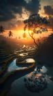 Ce papier peint intissé offre une vue spectaculaire avec ses arbres majestueux, ses chemins d'eau sinueux et son coucher de soleil chatoyant. Les nuances d'orange vif ajoutent une touche vibrante à votre intérieur, créant une ambiance chaleureuse et accueillante.
