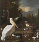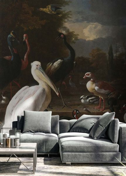 Ce papier peint nature représente une scène dynamique et vibrante mettant en vedette différentes espèces d'oiseaux aquatiques dans un cadre naturel. Au centre de la composition se trouve un grand pélican blanc, imposant et majestueux, se distinguant nettement sur le fond d'un paysage boisé. Autour de lui, différentes espèces de canards et de grues aux couleurs saisissantes s’ajoutent à la diversité de cette scène.