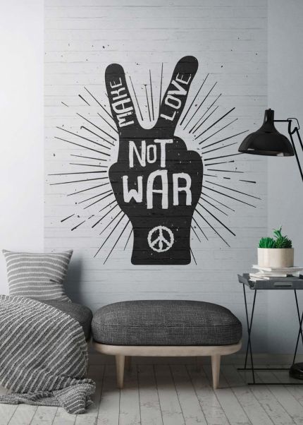 Le papier peint Zayden Noir et Blanc est la solution idéale pour ceux qui souhaitent apporter élégance et modernité à leur intérieur. Fabriqué sur une base intissée de haute qualité, ce papier peint au design antimilitariste et minimaliste allie style et fonctionnalité. L’élément central est une image graphique d’une main formant le signe de la paix (« peace »), accompagnée de l’inscription « NOT WAR » et du symbole pacifiste. La main est entourée d’un halo rayonnant qui crée un effet visuel dynamique. Sur les doigts figurent les mots « MAKE » et « LOVE ». Le design monochrome s’intègre parfaitement dans un intérieur scandinave contemporain ou un style loft.